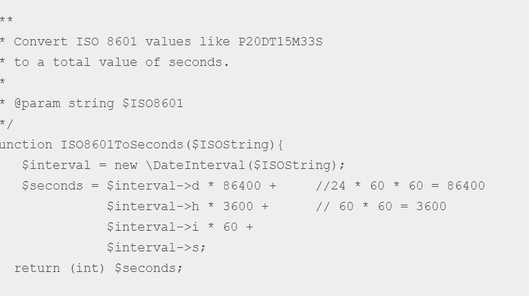 echo ISO8601ToSeconds('P20DT15M33S'); // Returns a value of 1728933